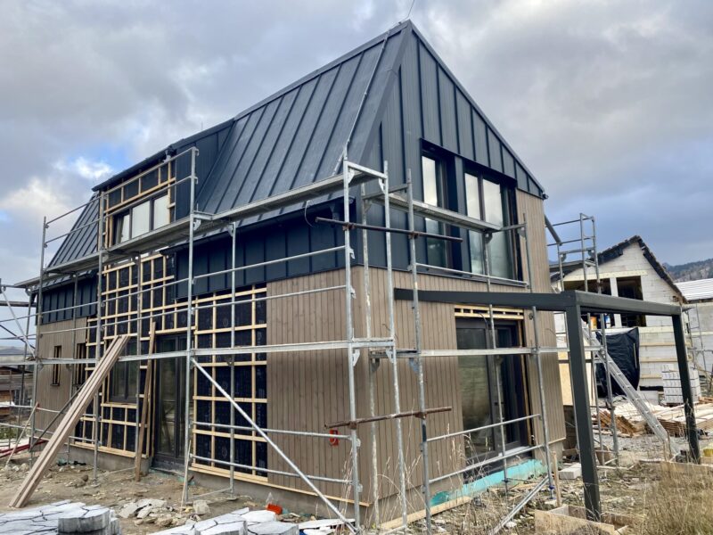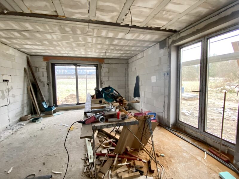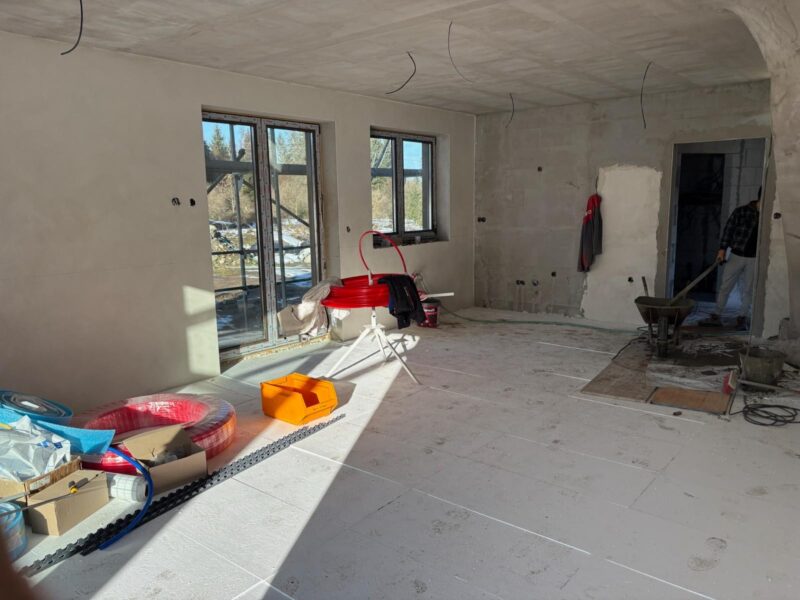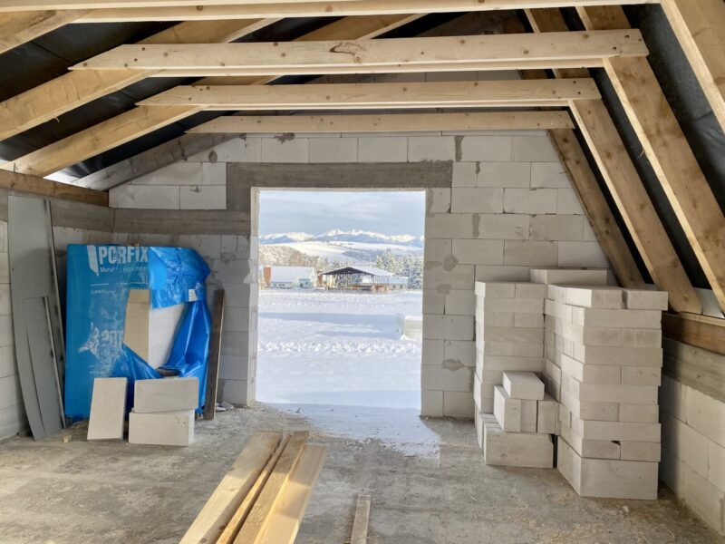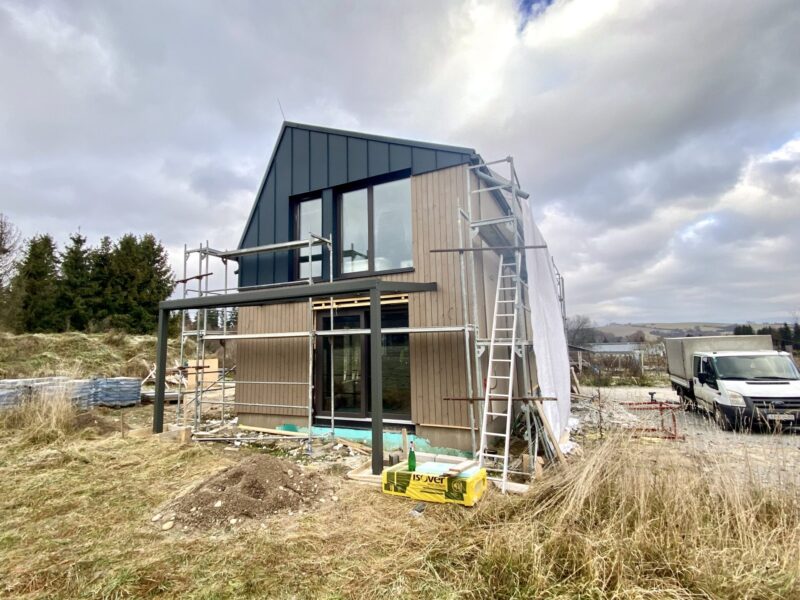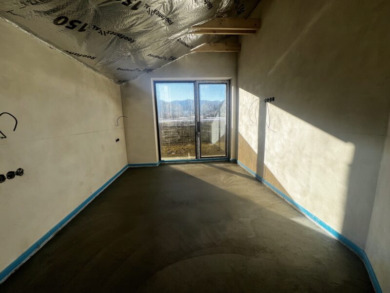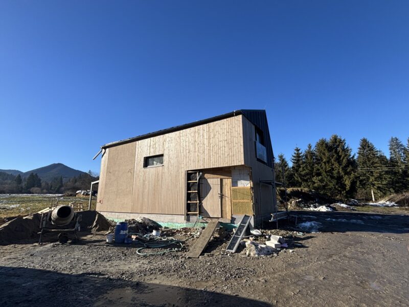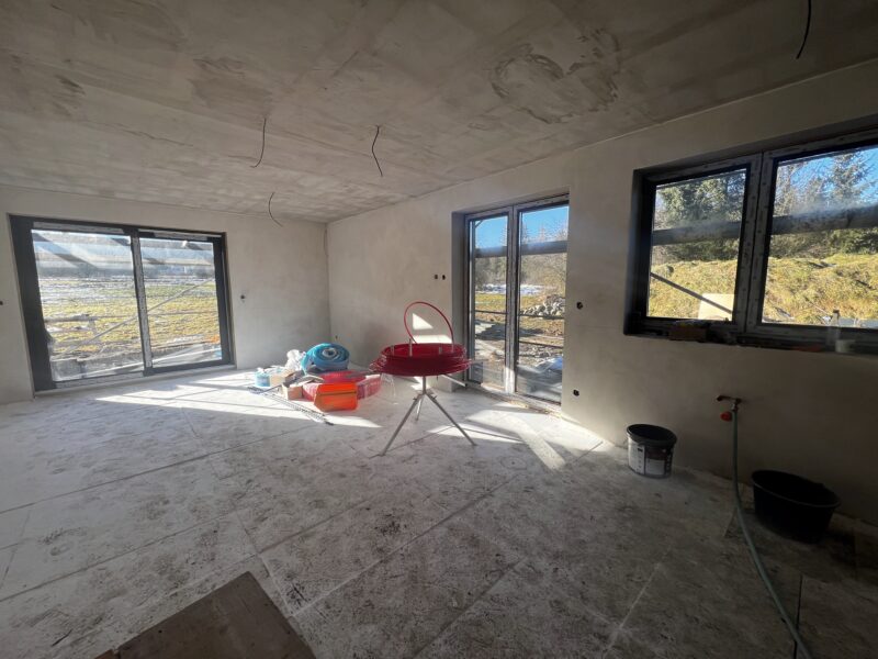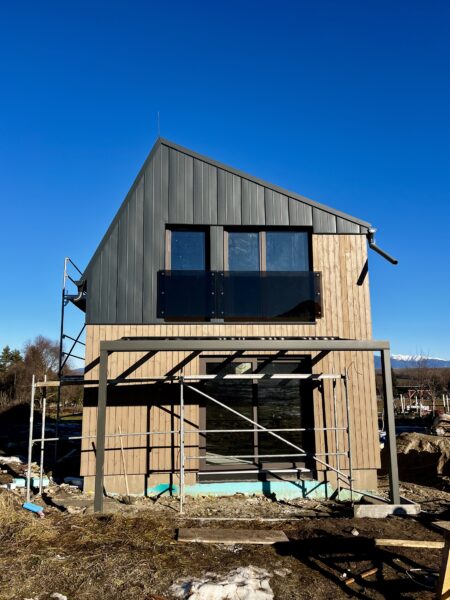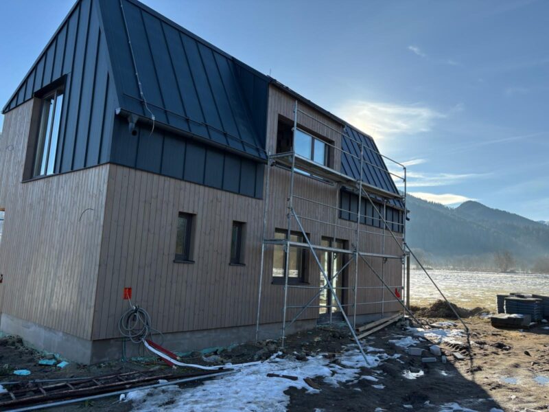 - Na vzorovej vile prebieha vonkajší obklad fasády z prírodného dreva a zároveň sa vnútri robia omietky.