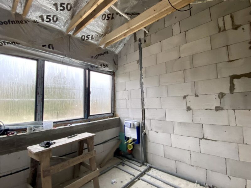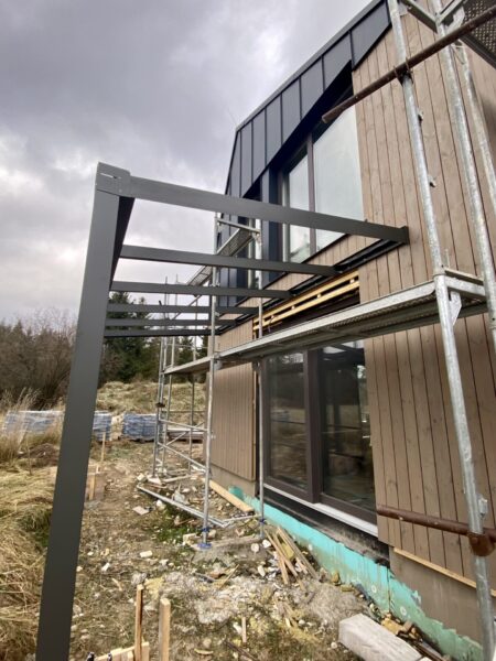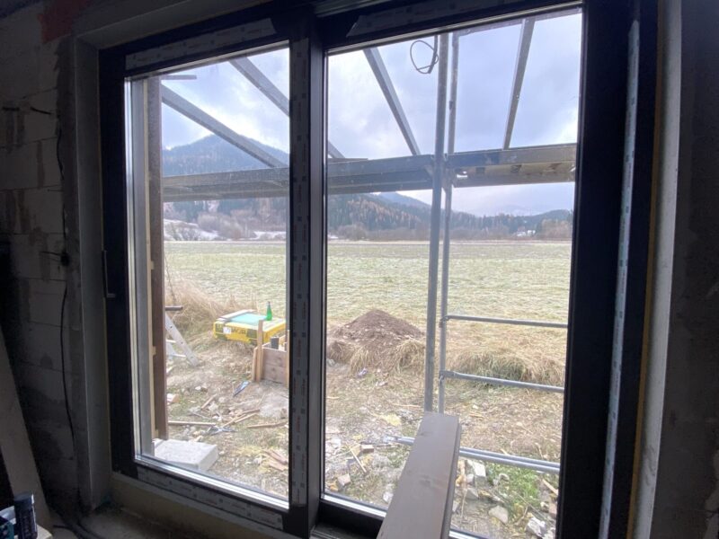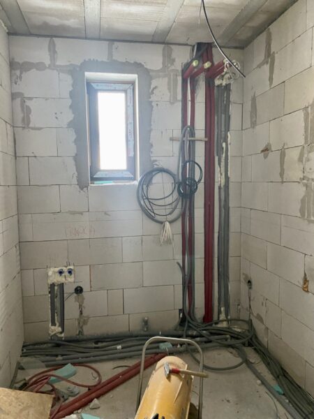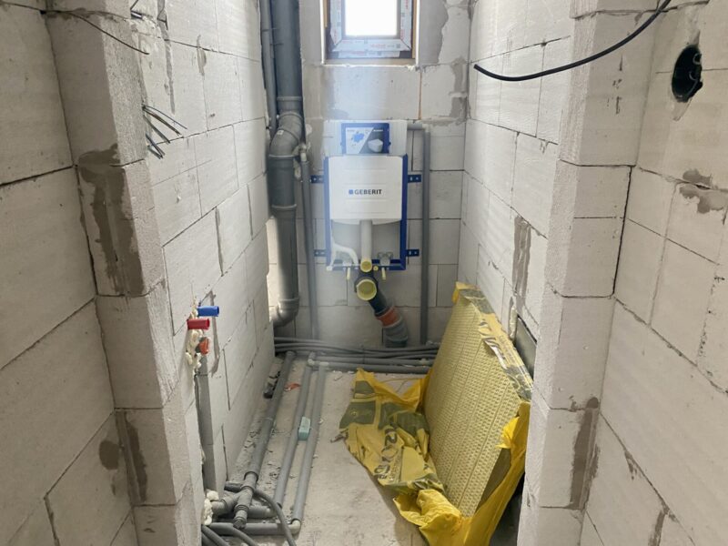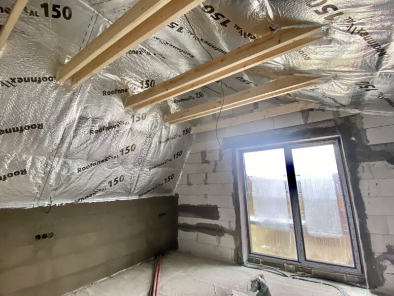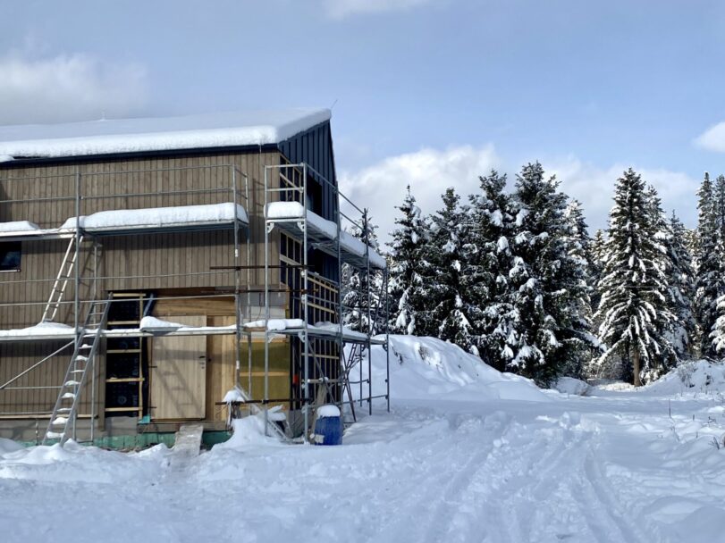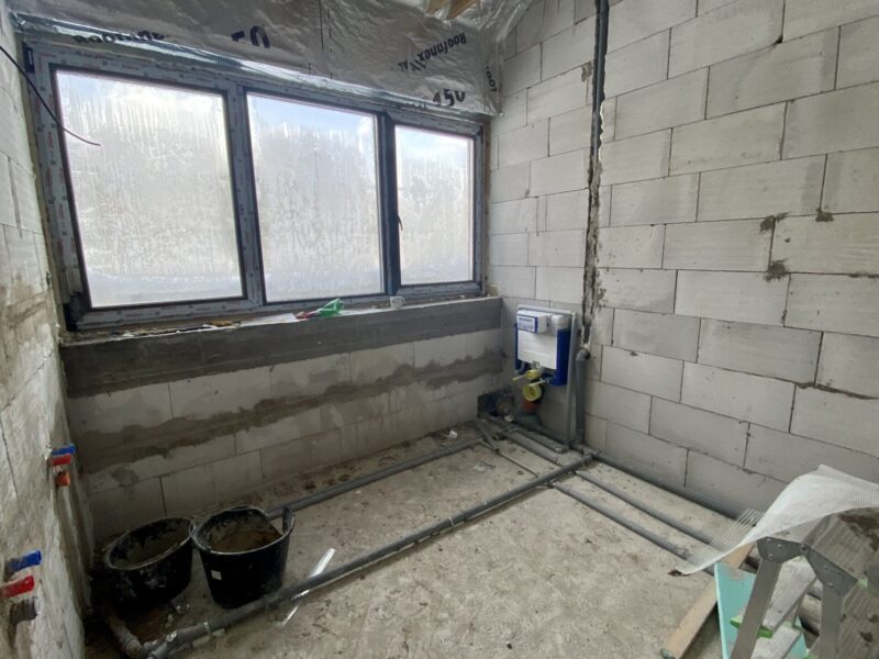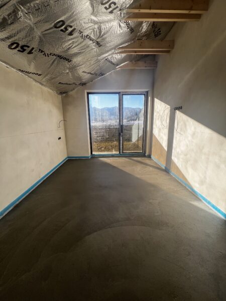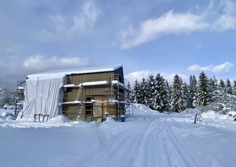 - Na vzorovej vile prebieha vonkajší obklad fasády z prírodného dreva a zároveň sa vnútri robia omietky.