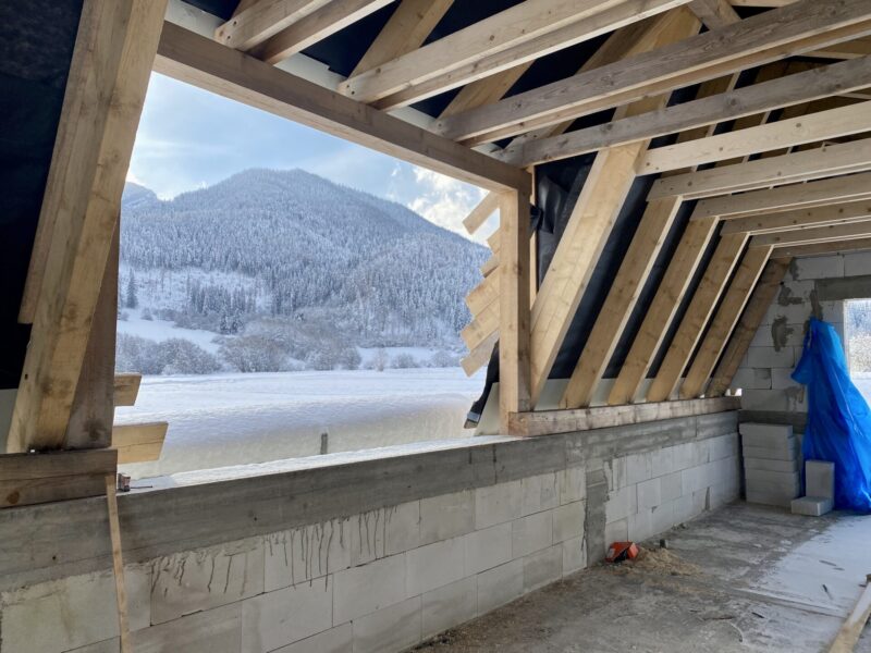 - Prvá vila (vzorová) je kompletne uzavretá. Má hotovú strechu aj osadené okná. Taktiež má hotové vnútorné priečky, zateplenie strechy, rozvody elektriny, rozvody vody a osadenú konštrukciu na prestrešenie terasy.